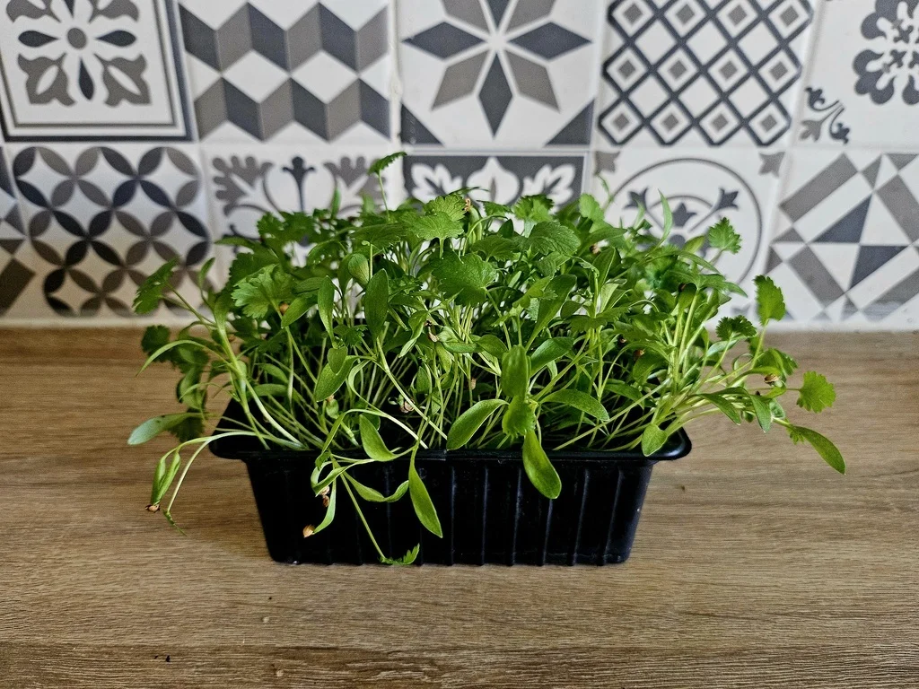 La micropousse de coriandre : goût très aromatique, très recherché par les amateurs. Germination lente mais résultat incroyable. Incontournable pour les cuisines du monde : tacos, ceviche, bowls, cuisine orientale, asiatique et salades fraîches.